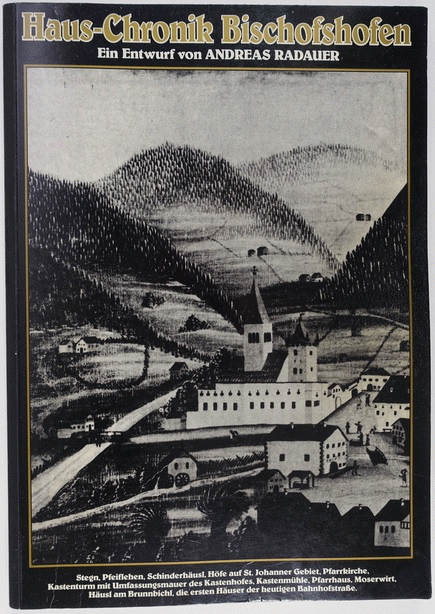 Haus-Chronik Bischofshofen ein Entwurf von Andreas Radauer ; Stegn, Pfeiflehen, Schinderhäusl, Höfe auf St. Johanner Gebiet, Pfarrkirche, Kastenturm mit Umfassungsmauer des Kastenhofes, Kastenmühle, Pfarrhaus, Moserwirt, Häusl am Brunnbichl, die ersten Häuser der heutigen Bahnhofsstraße